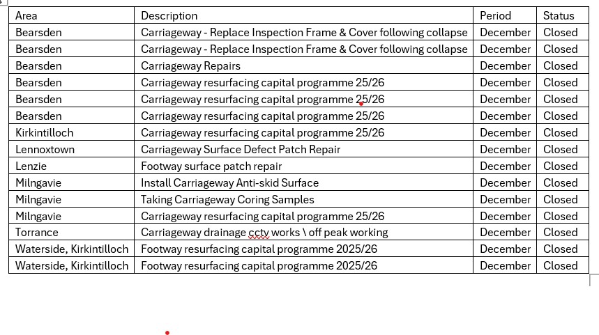 Works continue to progress at Bearsden Community Hub to remove and replace RAAC from the roof on the extension at the rear of the building (completion expected in January 2026) and refurbishments of Milngavie Primary School (completion July 2026); and through the construction of a replacement Balmuildy Primary School. Works are also progressing at Torrance Community Centre, which continues to have a revised completion date of April 2026.