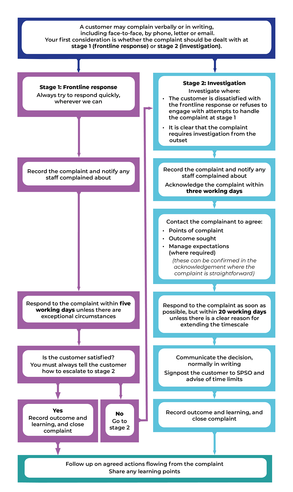 A customer may complain verbally or in writing, including face-to-face, by phone, letter or email. Your first consideration is whether the complaint should be dealt with at stage 1 (frontline response) or stage 2 (investigation). Stage 1: Frontline response Always try to respond quickly, wherever we can down to Record the complaint and notify any staff complained about down to Respond to the complaint within five working days unless there are exceptional circumstances down to Is the customer satisfied? You must always tell the customer how to escalate to stage 2 down to Yes Record outcome and learning, and close complaint No Go to stage 2 if yes Follow up on agreed actions flowing from the complaint Share any learning points. if stage 2 investigation: Stage 2: Investigation Investigate where: The customer is dissatisfied with the frontline response or refuses to engage with attempts to handle the complaint at stage 1 It is clear that the complaint requires investigation from the outset down to Record the complaint and notify any staff complained about Acknowledge the complaint within three working days down to Contact the complainant to agree: • Points of complaint • Outcome sought Manage expectations (where required) (these can be confirmed in the acknowledgement where the complaint is straightforward) down to Respond to the complaint as soon as possible, but within 20 working days unless there is a clear reason for extending the timescale down to Communicate the decision, normally in writing Signpost the customer to SPSO and advise of time limits down to Record outcome and learning, and close complaint down to Follow up on agreed actions flowing from the complaint Share any learning points